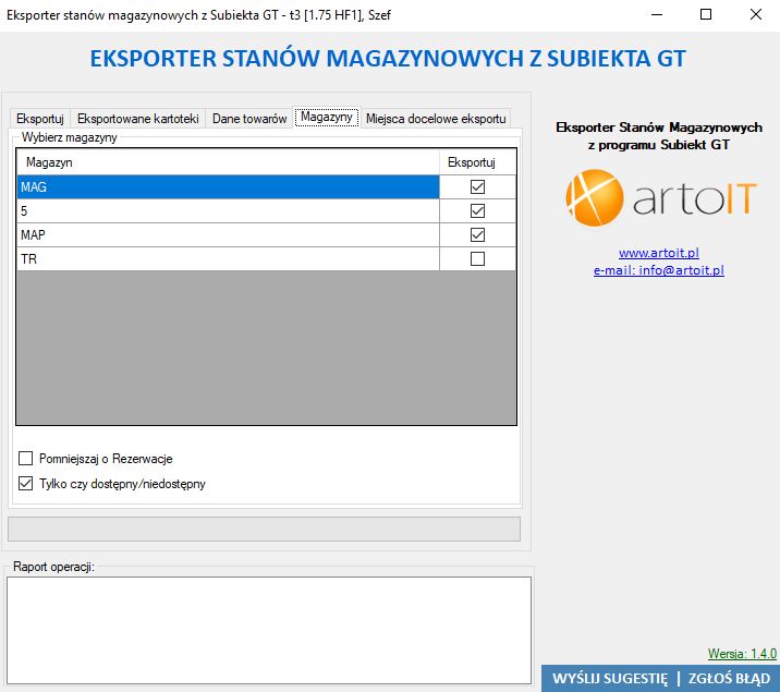 - UWAGA - w wersji 1.4.0 należy ponownie wybrać magazyny, z których mają być eksportowane stany