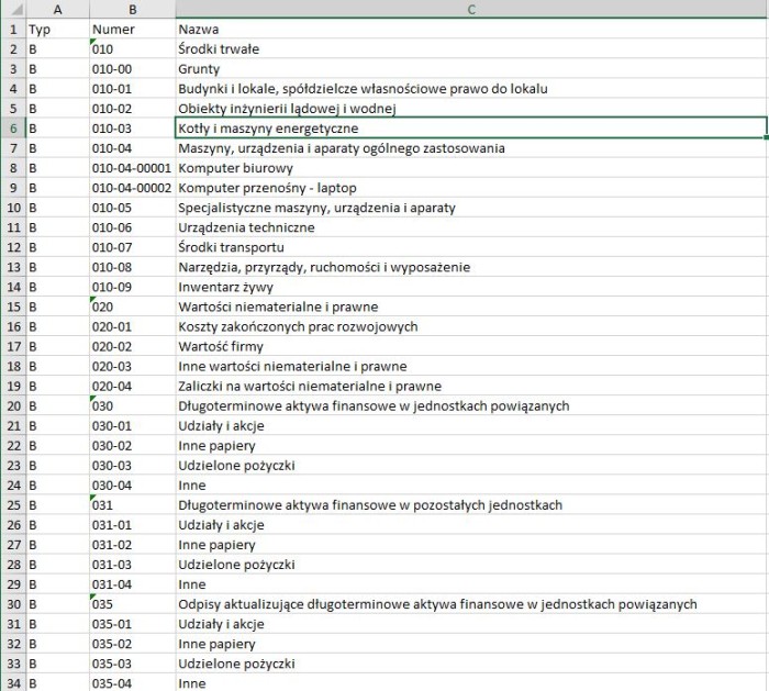 Opisy pól importera Planu Kont