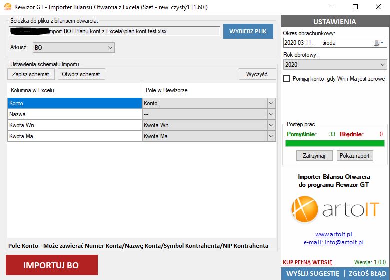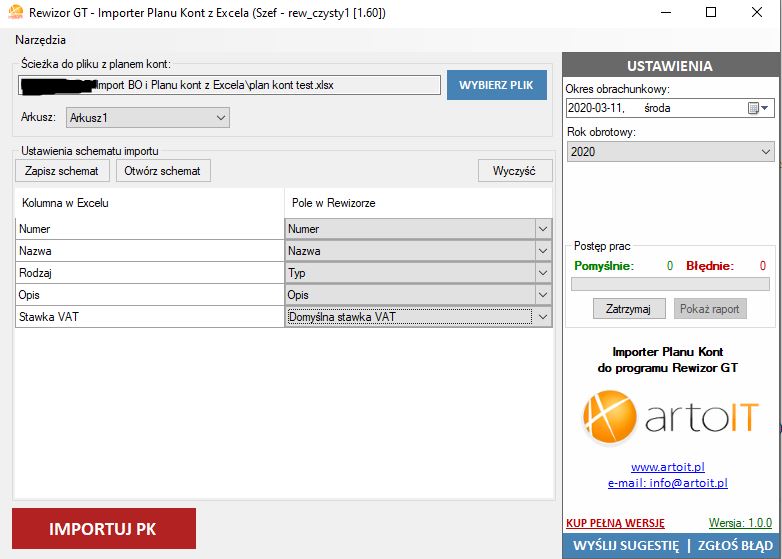 Importer Planu Kont (PK) i Bilansu Otwarcia (BO) z Excel do Rewizora GT