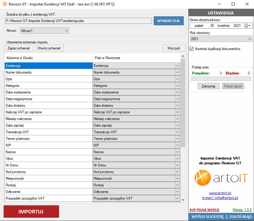 Nie ma sztywnych wymagań co do schematów plików xls i xlsx, z których następuje import, ponieważ w programie samemu definiujemy schemat importu. Wybieramy jakie dane mają trafić do Rewizora z wybranych kolumn. Dzięki temu program ma charakter uniwersalny i może działać z wieloma dostawcami.