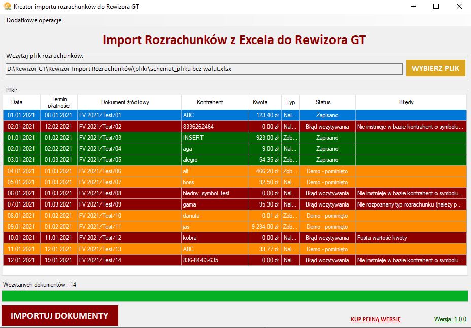 Program można uruchomić w wersji testowej. Należ wtedy w polach NIP i Klucz wpisać „demo”. W wersji testowej program umożliwia import do 5 rozrachunków z pliku.