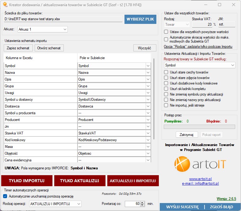 - Dodano możliwość automatycznych operacji aktualizacji/importu co zadany czas. Program umożliwia teraz automatyczne wczytywanie pliku i wykonuje zadaną operację w określonych odstępach czasu.