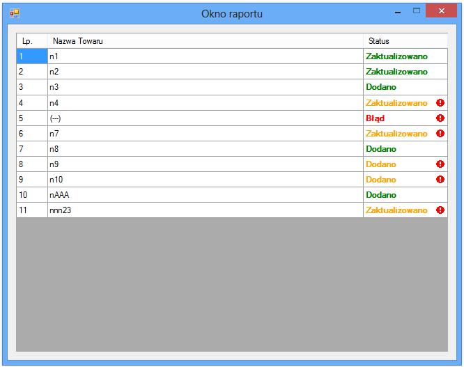 Po dodawaniu / aktualizowaniu towarów pojawi się okno z raportem, dzięki któremu można odczytać informacje z działania programu.
