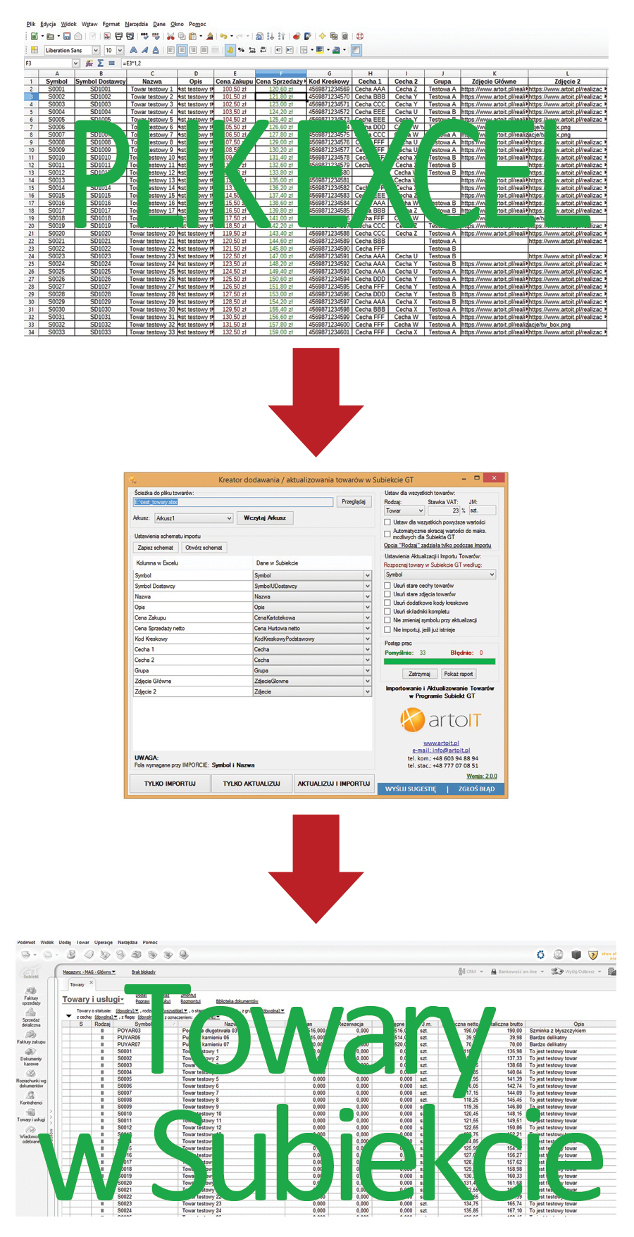 Przygotowany wcześniej arkusz excel wczytywany jest przez program, a następnie użytkownik wybiera, które kolumny we wczytanym arkuszu mają odpowiadać określonym polom w Subiekcie GT (np. symbol, nazwa, cena, zdjęcie, cecha itp.). Następnie po kliknięciu jednego przycisku do systemu Subiekt GT zostaną dodane towary, wraz ze zdefiniowanymi parametrami. Po wykonanej operacji program wyświetli szczegółowy raport, zawierający informacje które pozycje dodano lub zaktualizowano, a także jakie błędy wystąpiły podczas tych operacji. Dzięki temu w prosty sposób będziemy mogli sprawdzić, czy dane towarów są prawidłowo zaimportowane do Subiekta.