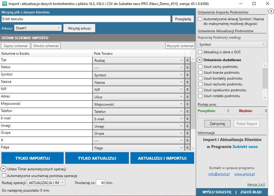 Przygotowany wcześniej arkusz excel lub plik CSV wczytywany jest przez program, a następnie użytkownik wybiera, które kolumny we wczytanym arkuszu mają odpowiadać określonym polom towaru w Subiekcie (np. symbol, NIP, nazwa, zdjęcie itp.). Następnie po kliknięciu jednego przycisku do systemu Subiekt nexo PRO zostaną dodane podmioty, wraz ze zdefiniowanymi parametrami. Po wykonanej operacji program wyświetli szczegółowy raport, zawierający informacje które pozycje dodano lub zaktualizowano, a także jakie błędy wystąpiły podczas tych operacji. Dzięki temu w prosty sposób będziemy mogli sprawdzić, czy dane kontrahentów są prawidłowo zaimportowane do Subiekta.