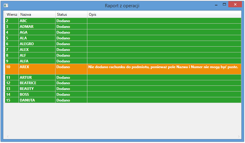 - czerwonym - nastąpił błąd i dana pozycja nie została w ogóle dodana / zmieniona.