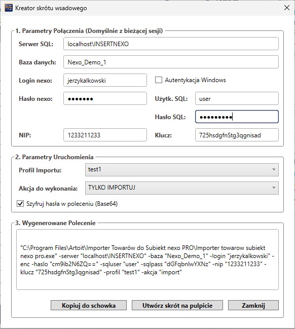 Program ma możliwość uruchamiania w trybie wsadowym*. Dzięki modułowi kreator skrótów możemy utworzyć ikonki, które uruchomią program w tle z zadanymi parametrami.