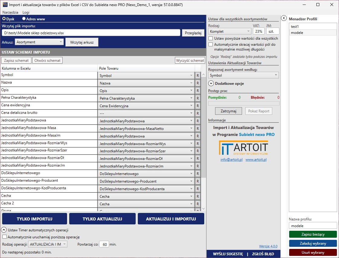 - tylko importuj - program zaimportuje asortymenty do Subiekta nexo PRO z arkusza excel.